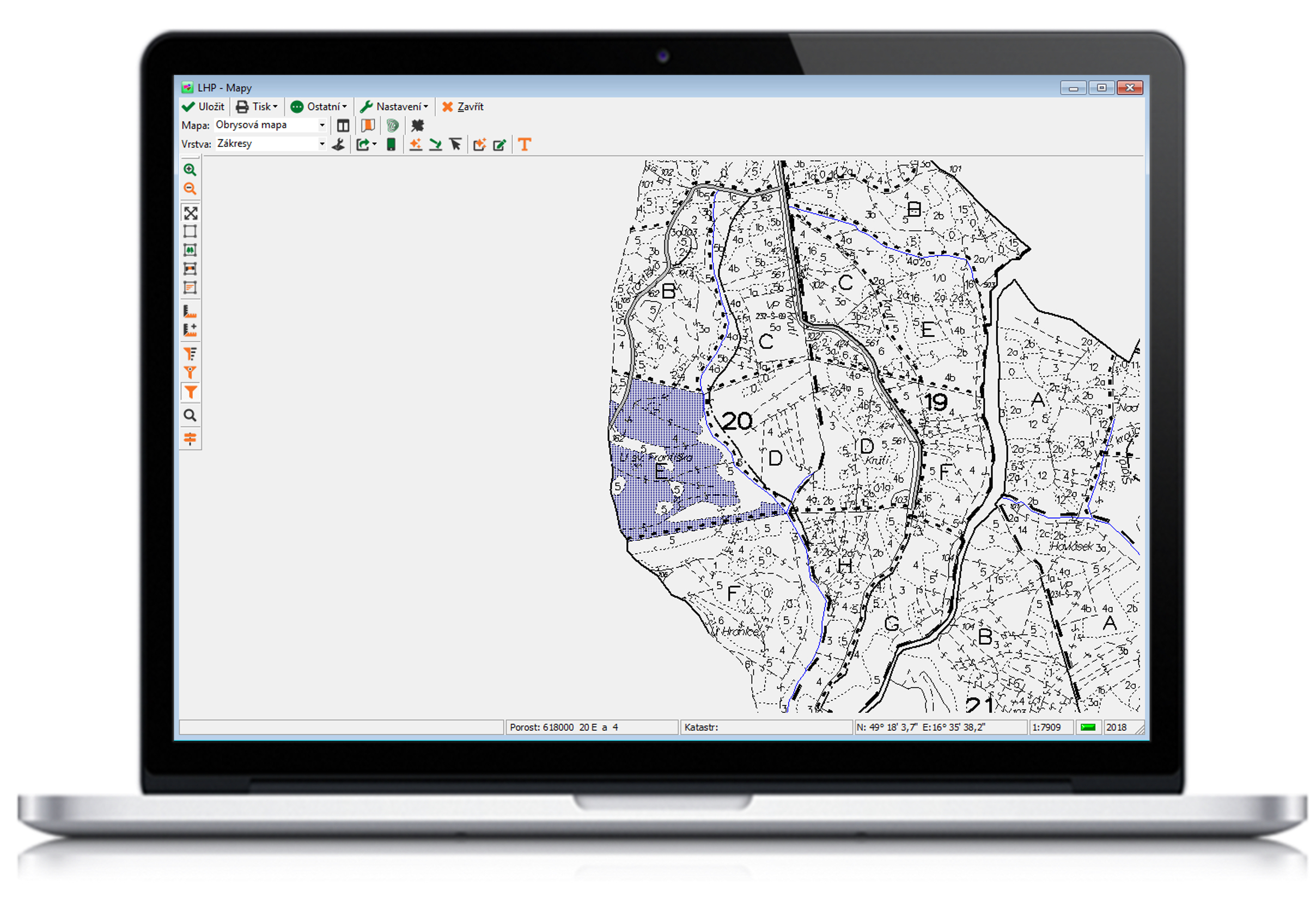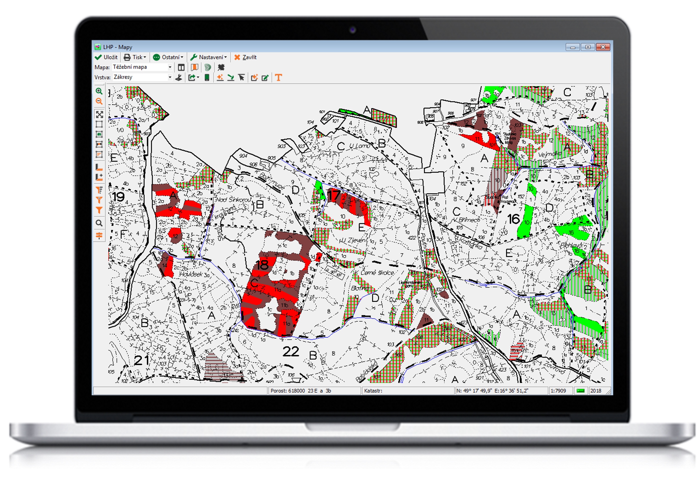• prohlížení lesních hospodářských plánů, kde se zobrazují všechna potřebná data LHP a LHO (včetně detailů) a příslušných mapových podkladů