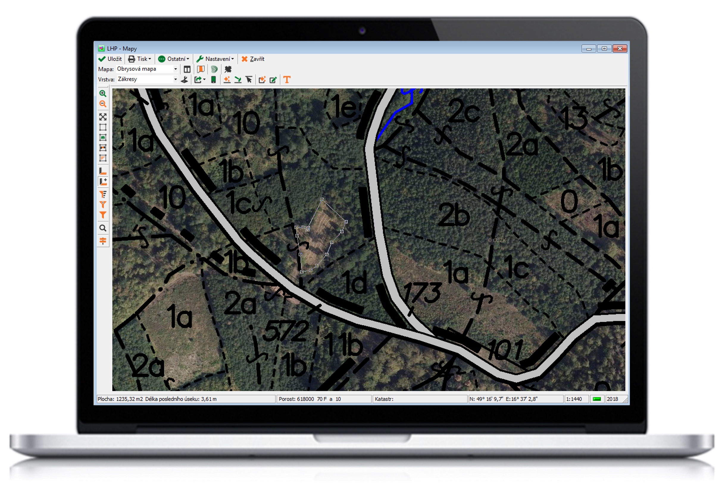 • možnost výběru ze základních typů map (porostní, těžební, obrysová atd.) s možností vytvoření vlastní mapy (a vlastních vrstev)