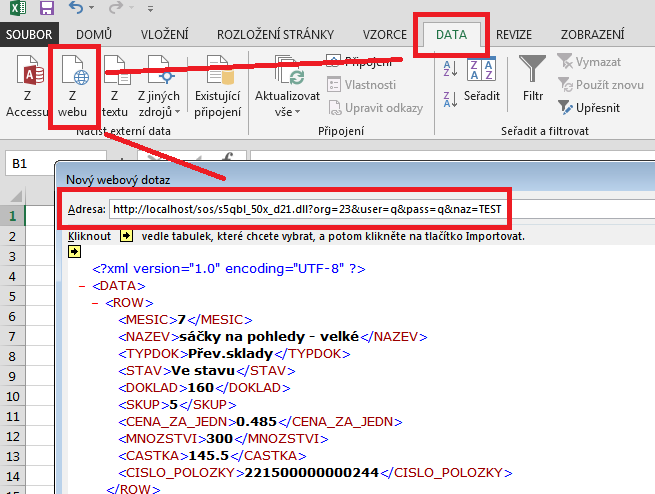 Propojení dotazu z návrháře dotazů se provádí pomocí menu Data — Z webu. Do URL adresy se následně vloží odkaz na příslušný dotaz v návrháři dotazů: